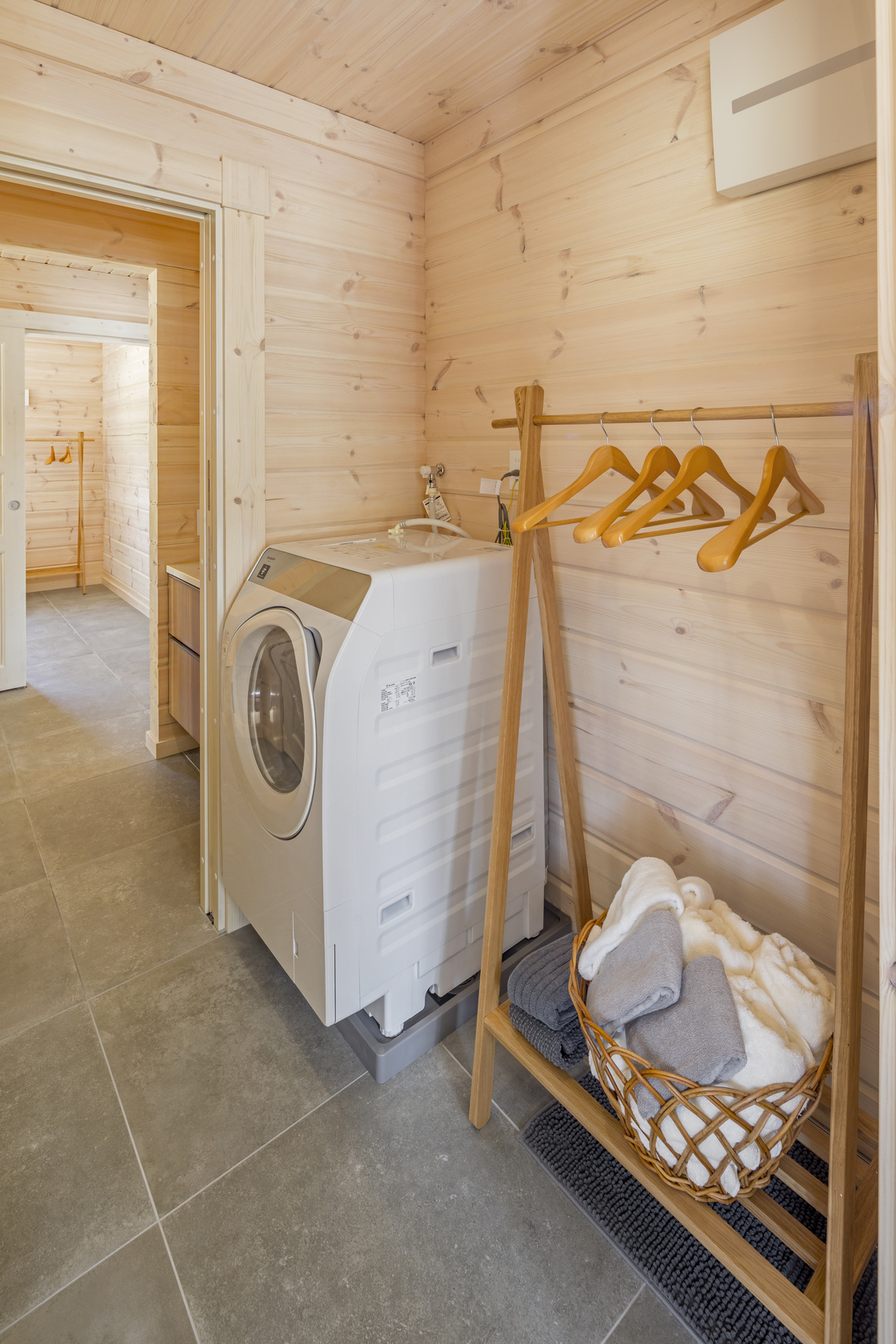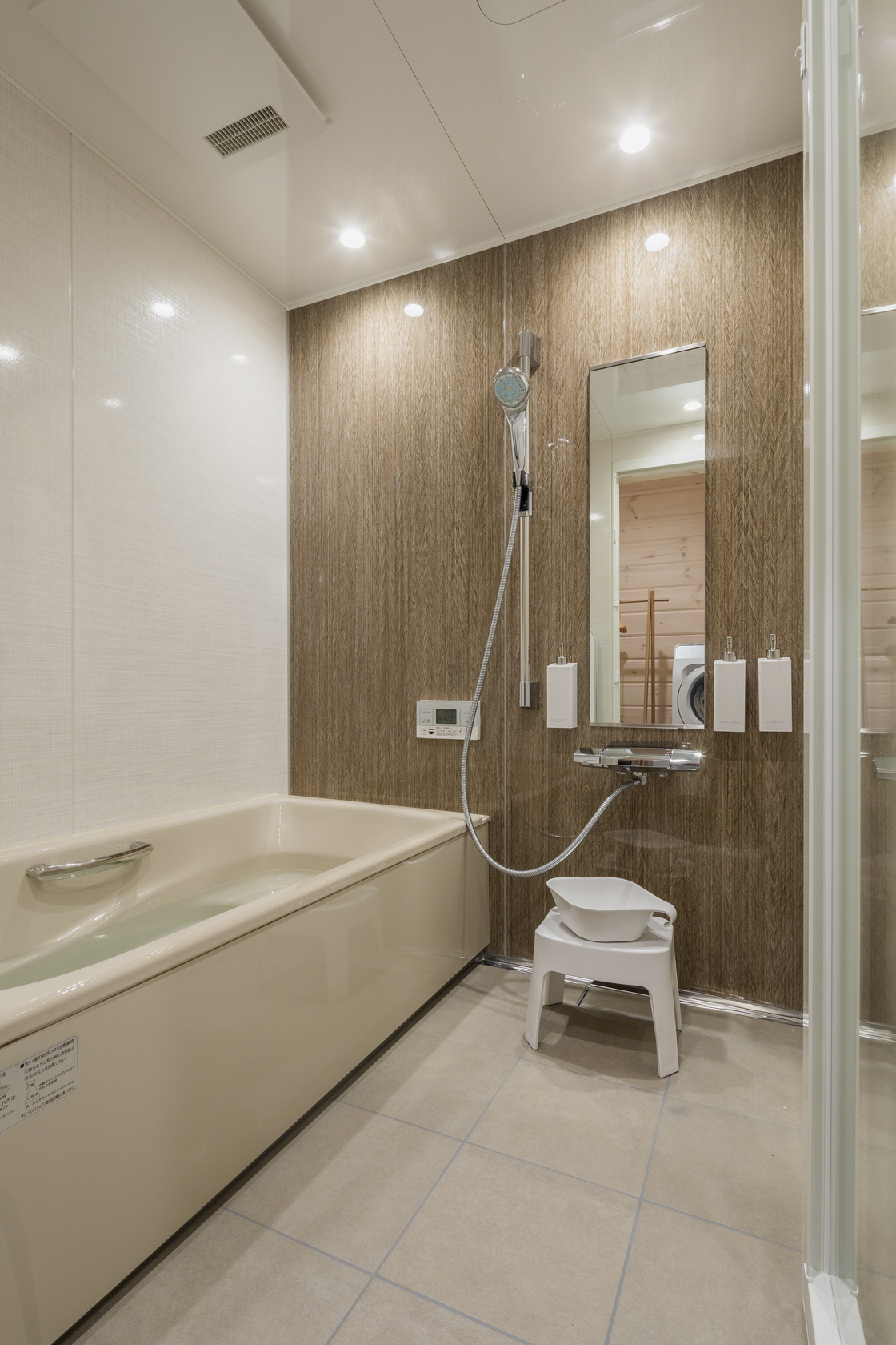 滞在中快適にお使いいただけるように、お湯をかけるだけで汚れが落ちるホーロー製のバスタブにRefaファインバブル Uシャワーヘッドを採用しました。ドラム式洗濯乾燥機、ウォシュレット付きトイレと洗面を設置しています。
