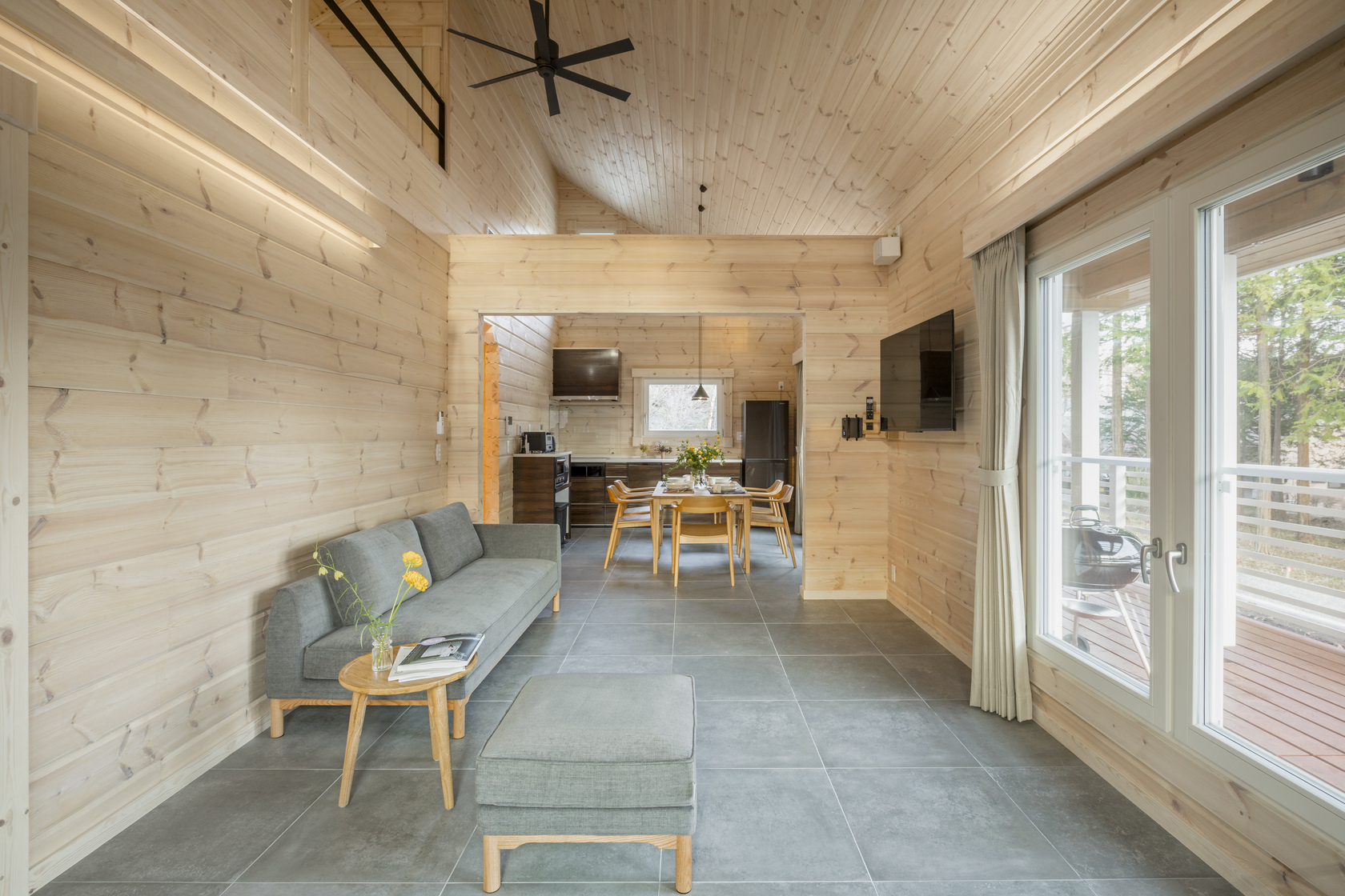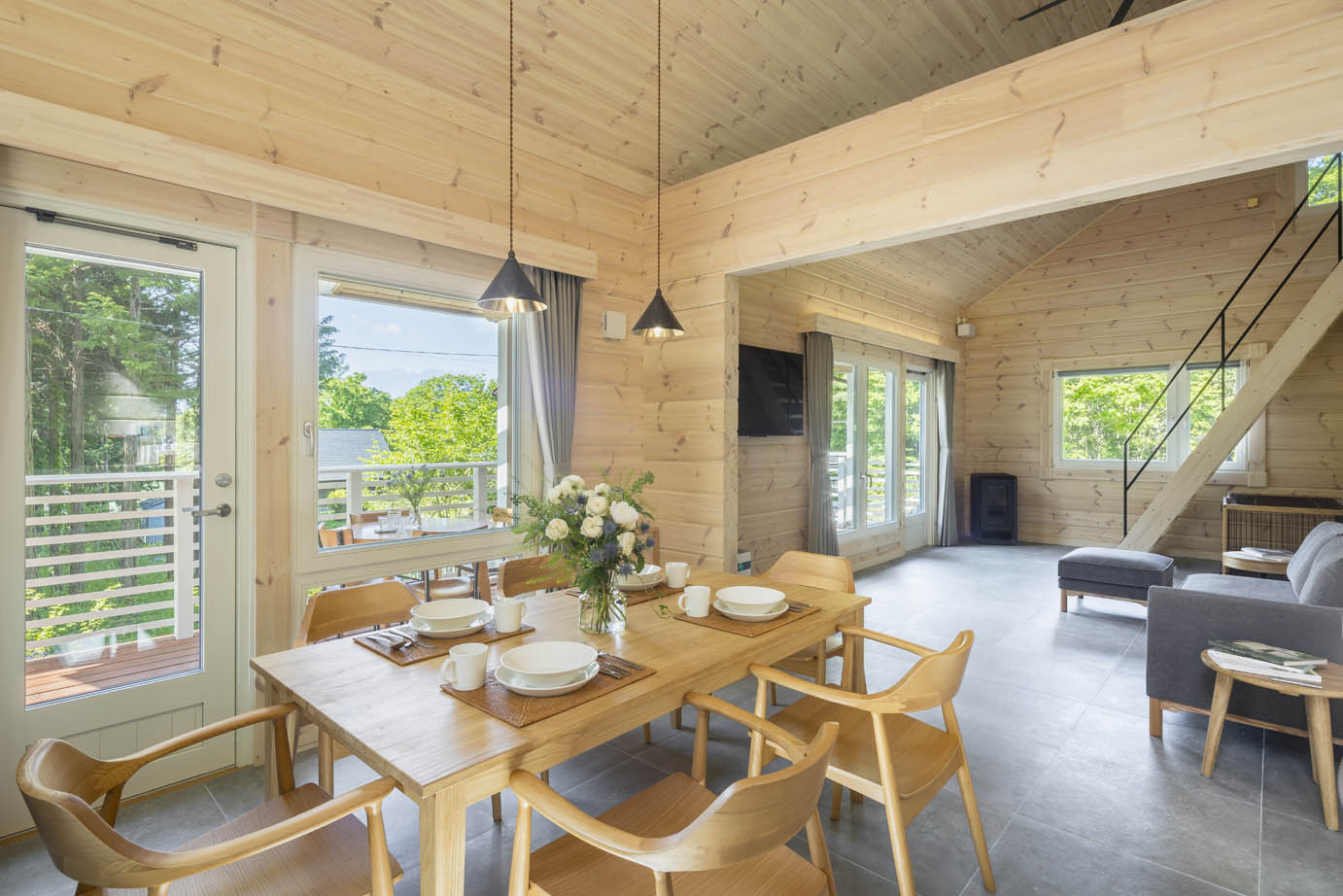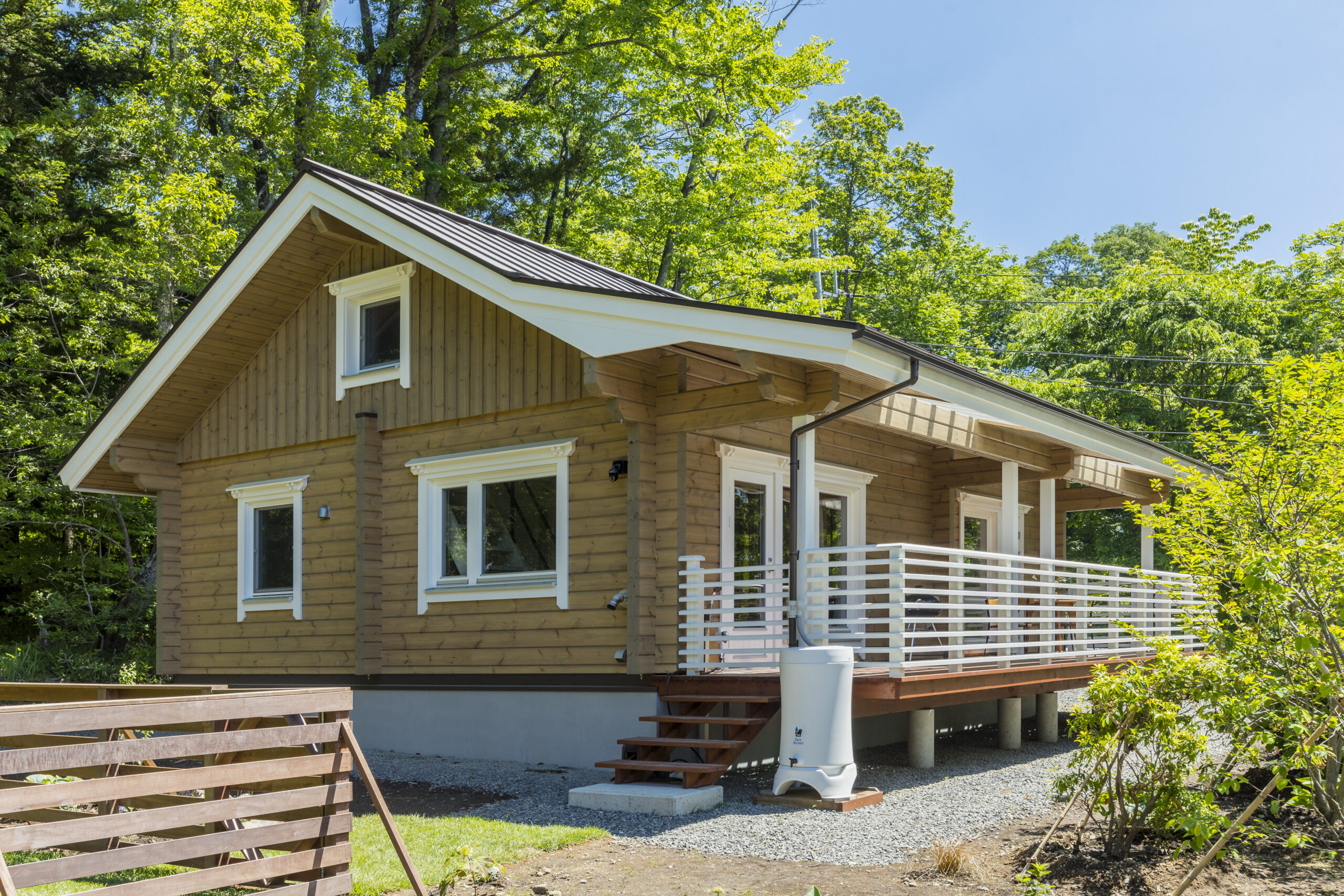 木の香りに包まれた癒しの空間に、二つのベッドルームとロフト、キッチン、ダイニングルーム、リビングルーム、お風呂、トイレ、洗面所、屋根付きのテラスを備えています。