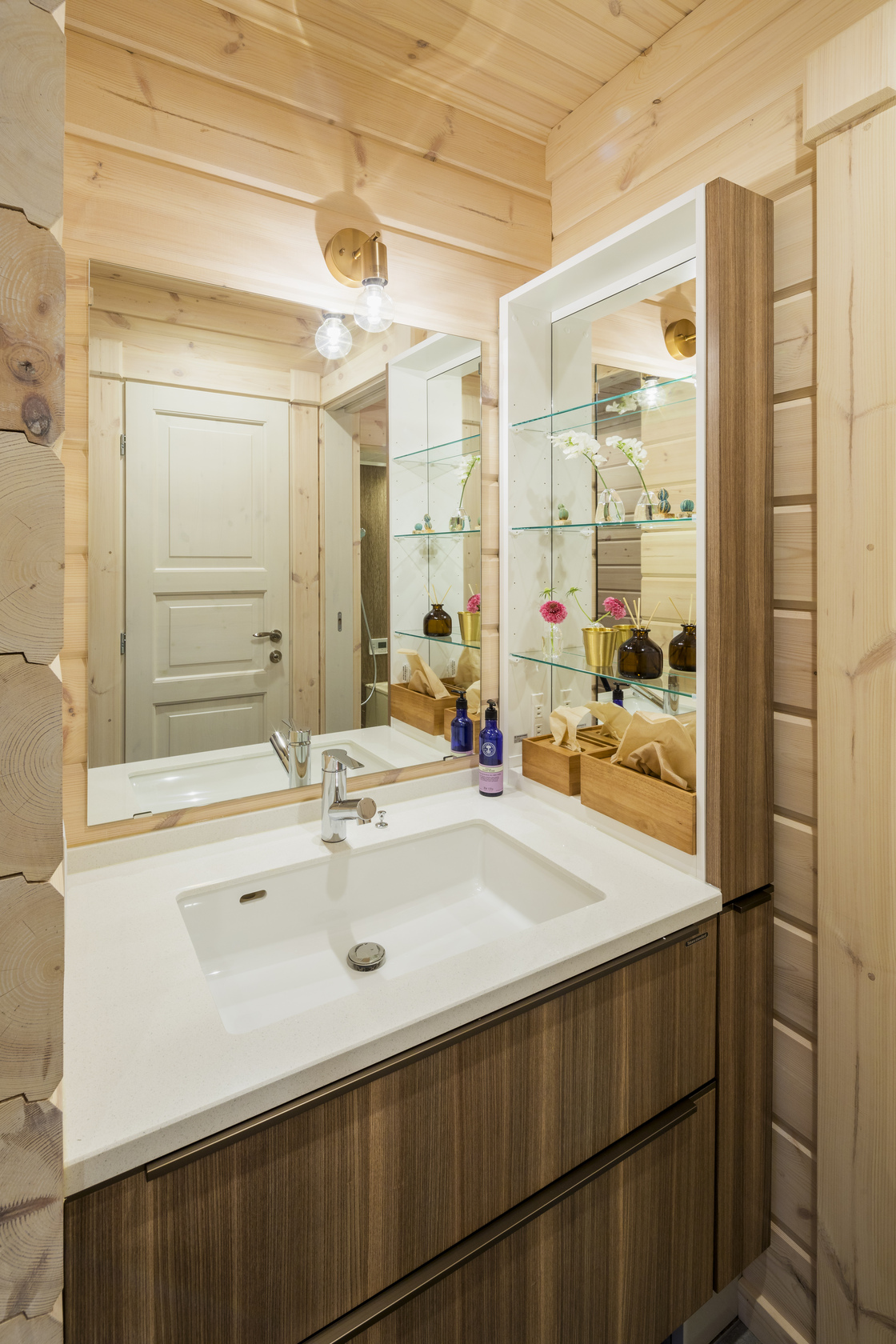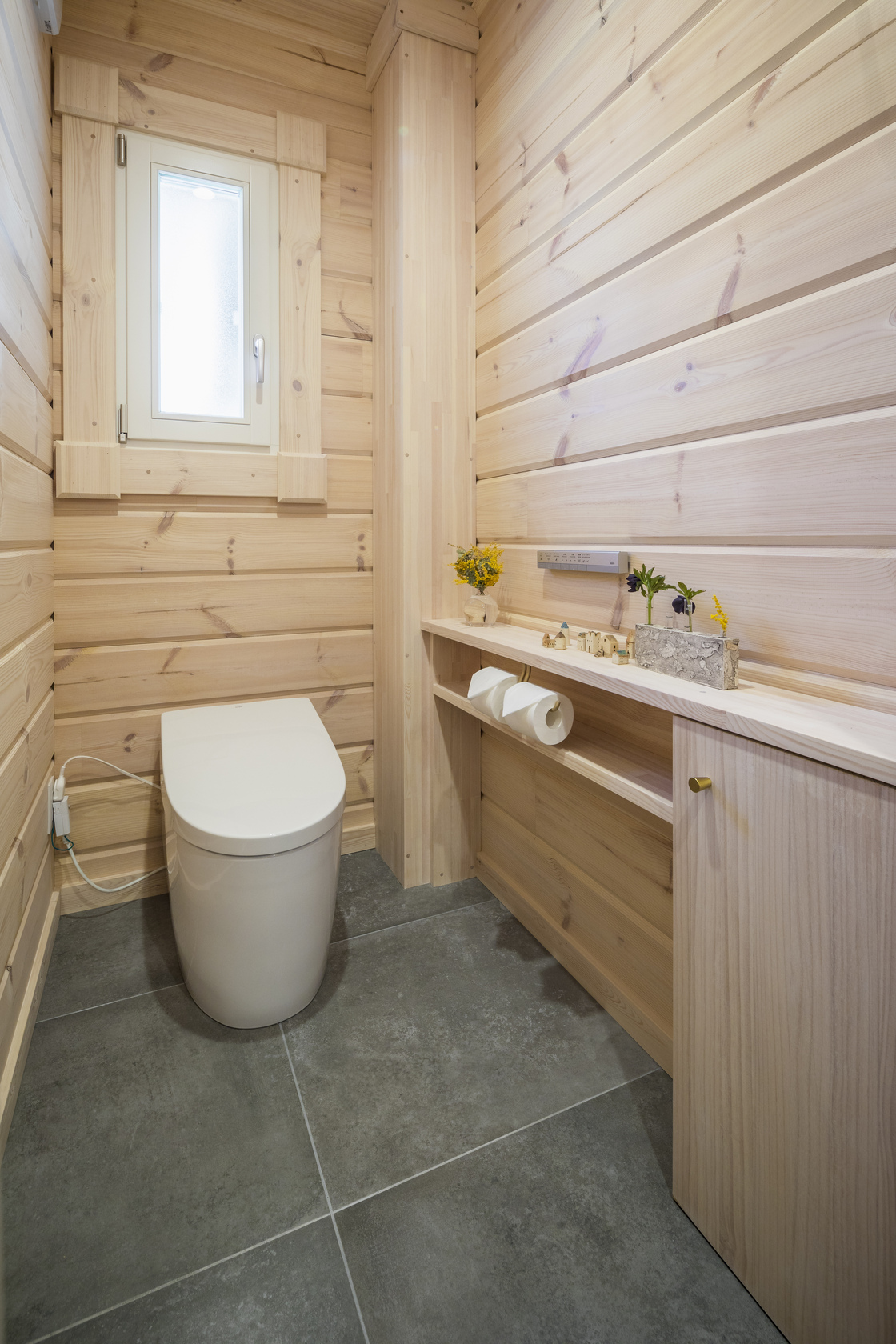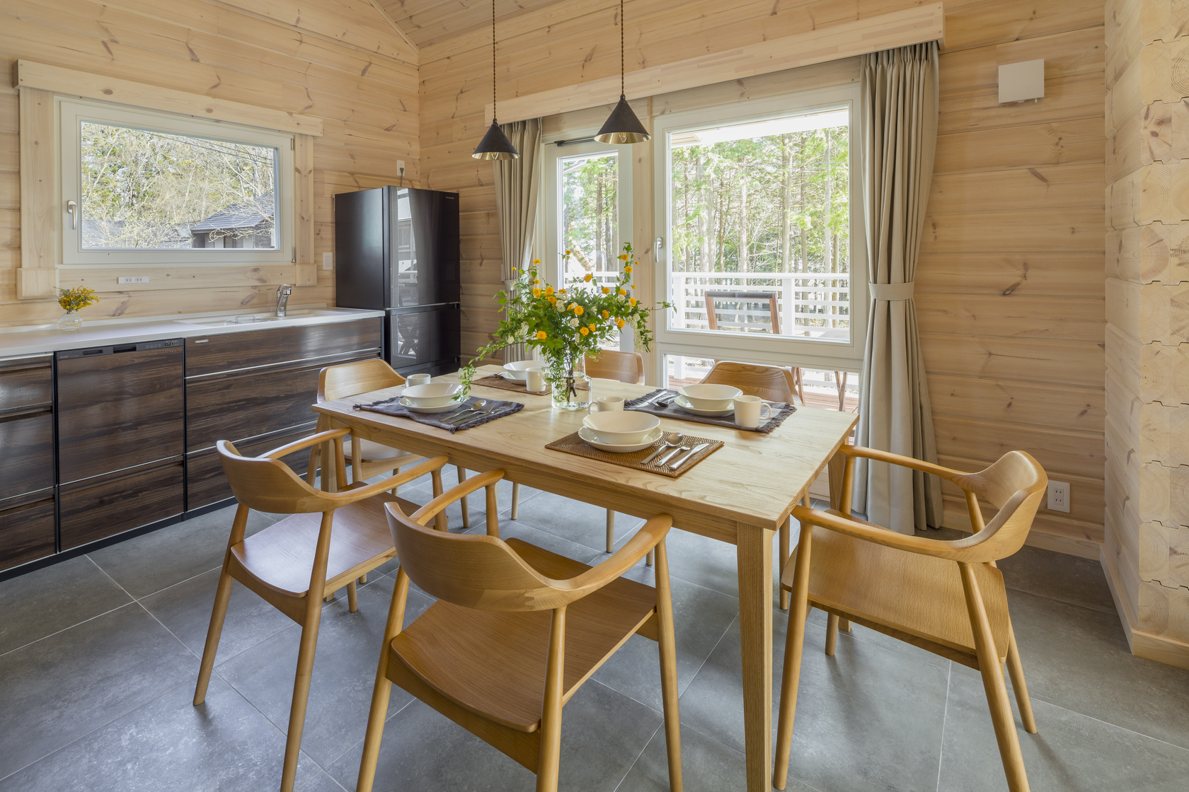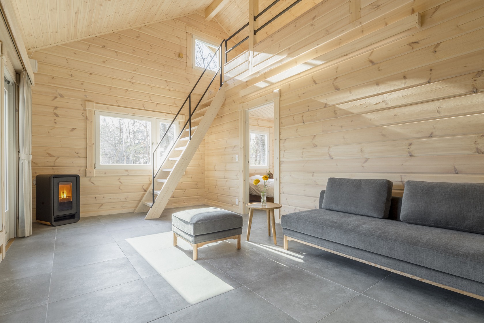 木の香りに包まれた癒しの空間に、二つのベッドルームとロフト、キッチン、ダイニングルーム、リビングルーム、お風呂、トイレ、洗面所、屋根付きのテラスを備えています。