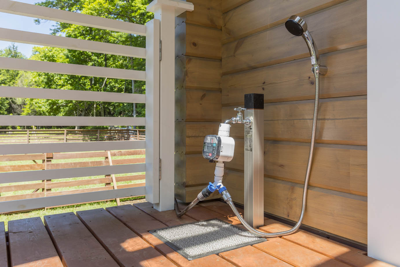 There is a 140 square meters natural grass dog run next to the building, a dog foot-washing area on the terrace, a barbecue grill, and electric car charging outlets. Please bring your own charger.